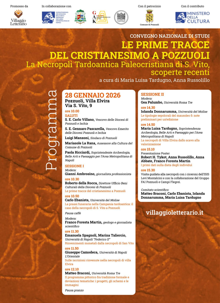 Mercoledì 28 gennaio 2026 la Necropoli tardoantica paleocristiana di San Vito ospita il Convegno Nazionale di Studi “Le prime tracce del cristianesimo a Pozzuoli: la necropoli tardoantica paleocristiana di San Vito”, promosso da Villaggio Letterario in collaborazione con la Soprintendenza Archeologia, Belle Arti e Paesaggio per l’Area Metropolitana di Napoli, con il contributo del Ministero della Cultura.