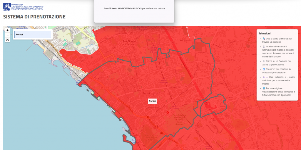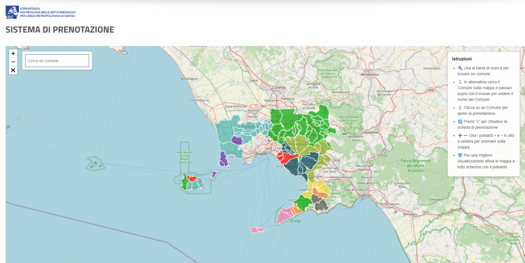Accedendo alla pagina del sito della Soprintendenza l’utente potrà visualizzare la mappa georefenziata con i limiti territoriali dei diversi comuni che compongono l’area metropolitana di Napoli (figura 1)