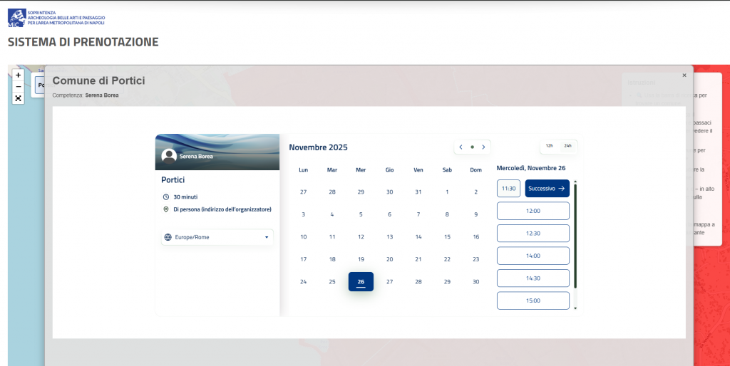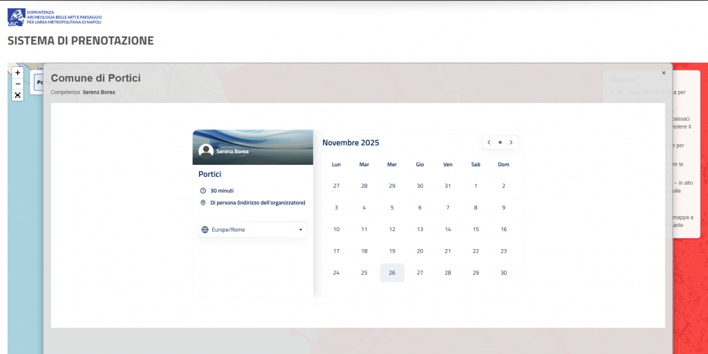 Cliccando sul territorio verrà visualizzata la relativa scheda di prenotazione del funzionario con il calendario delle disponibilità.