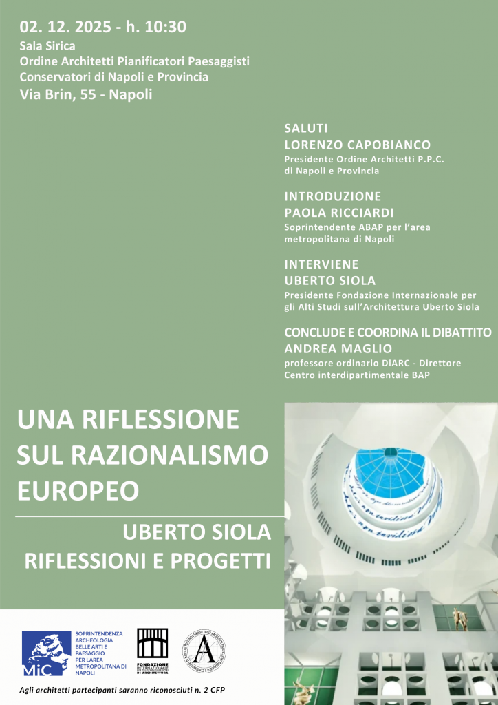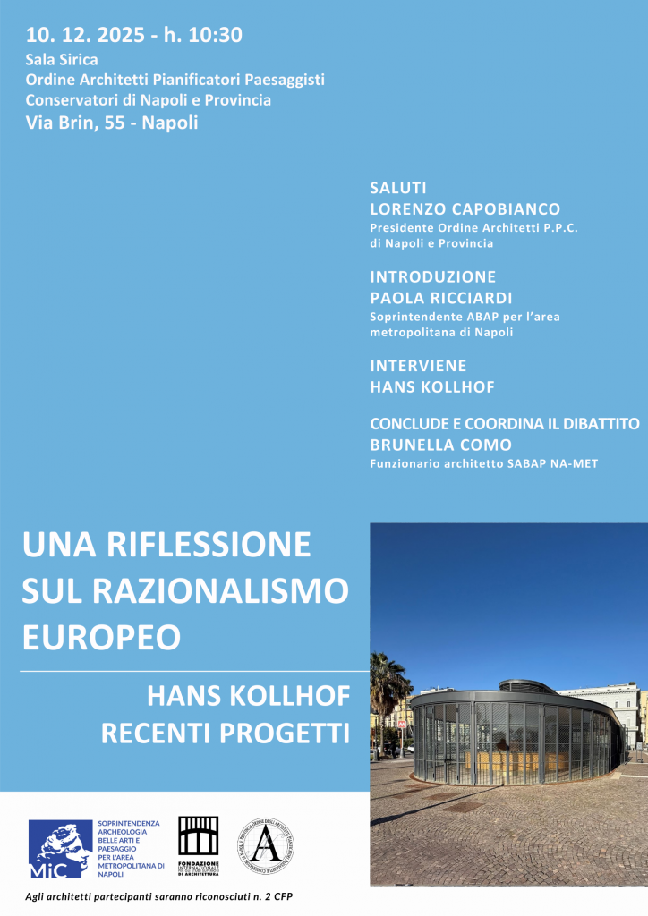 La Soprintendenza Archeologia, Belle Arti e Paesaggio per l’area metropolitana di Napoli promuove, in collaborazione con l’Ordine degli Architetti P.P.C. di Napoli e Provincia e con la Fondazione Internazionale per gli Alti Studi sull’Architettura, un ciclo di tre appuntamenti dedicati al razionalismo europeo, alle sue eredità teoriche e alle sue trasformazioni nel dibattito architettonico contemporaneo. Gli incontri, rivolti a professionisti, studiosi e appassionati di architettura, offriranno un confronto diretto con tre protagonisti del panorama internazionale, chiamati a condividere visioni, riflessioni e progetti recenti.