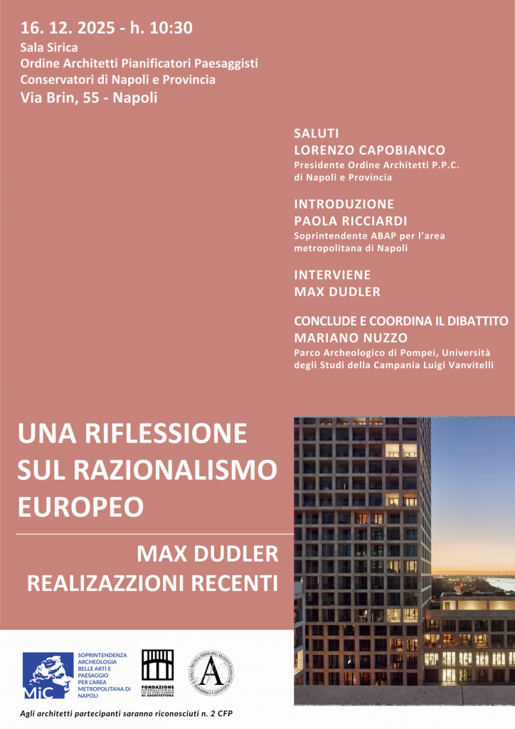 Ciclo di incontri con Uberto Siola, Hans Kollhoff e Max Dudler –Sala Sirica – Ordine Architetti Pianificatori Paesaggisti Conservatori di Napoli e Provincia, Via Brin, 55 – Napoli | 02 | 10 | 16 | dicembre 2025.