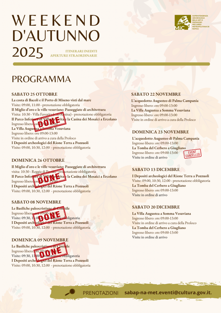 - 25-26 ottobre: la costa di Bacoli e il Porto di Miseno visti dal mare; le Passeggiate di architettura tra le ville vesuviane del Miglio d’Oro; apertura del Parco inferiore di Villa Favorita a Ercolano e della Villa Augustea di Somma Vesuviana; visite ai Depositi archeologici del Rione Terra a Pozzuoli.
