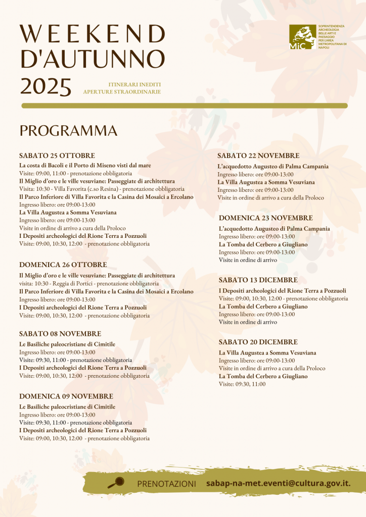 - 25-26 ottobre: la costa di Bacoli e il Porto di Miseno visti dal mare; le Passeggiate di architettura tra le ville vesuviane del Miglio d’Oro; apertura del Parco inferiore di Villa Favorita a Ercolano e della Villa Augustea di Somma Vesuviana; visite ai Depositi archeologici del Rione Terra a Pozzuoli.